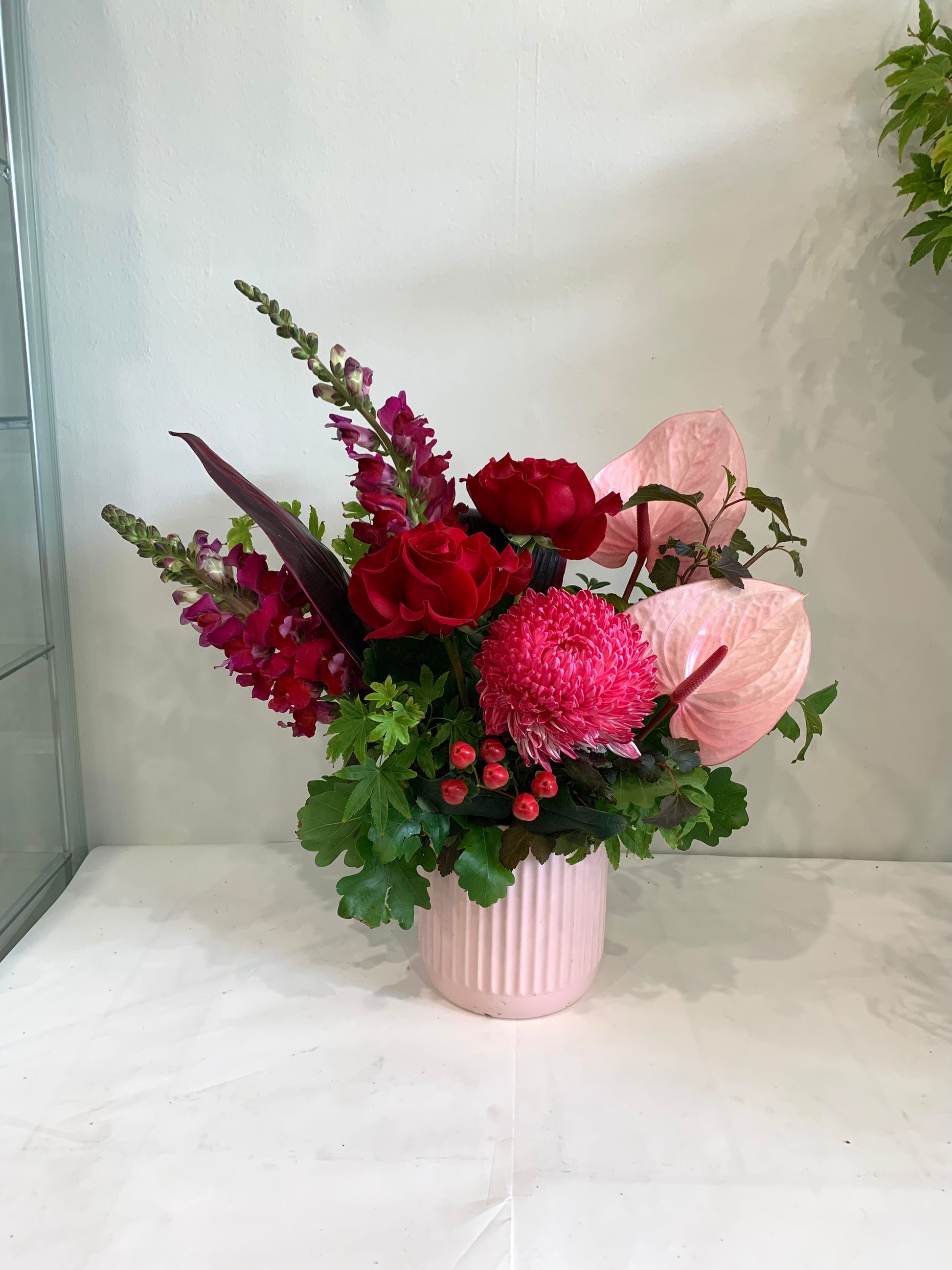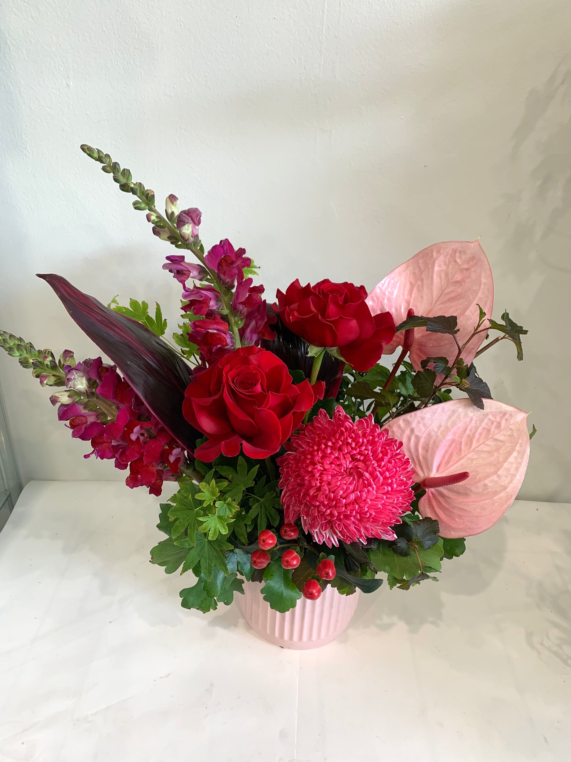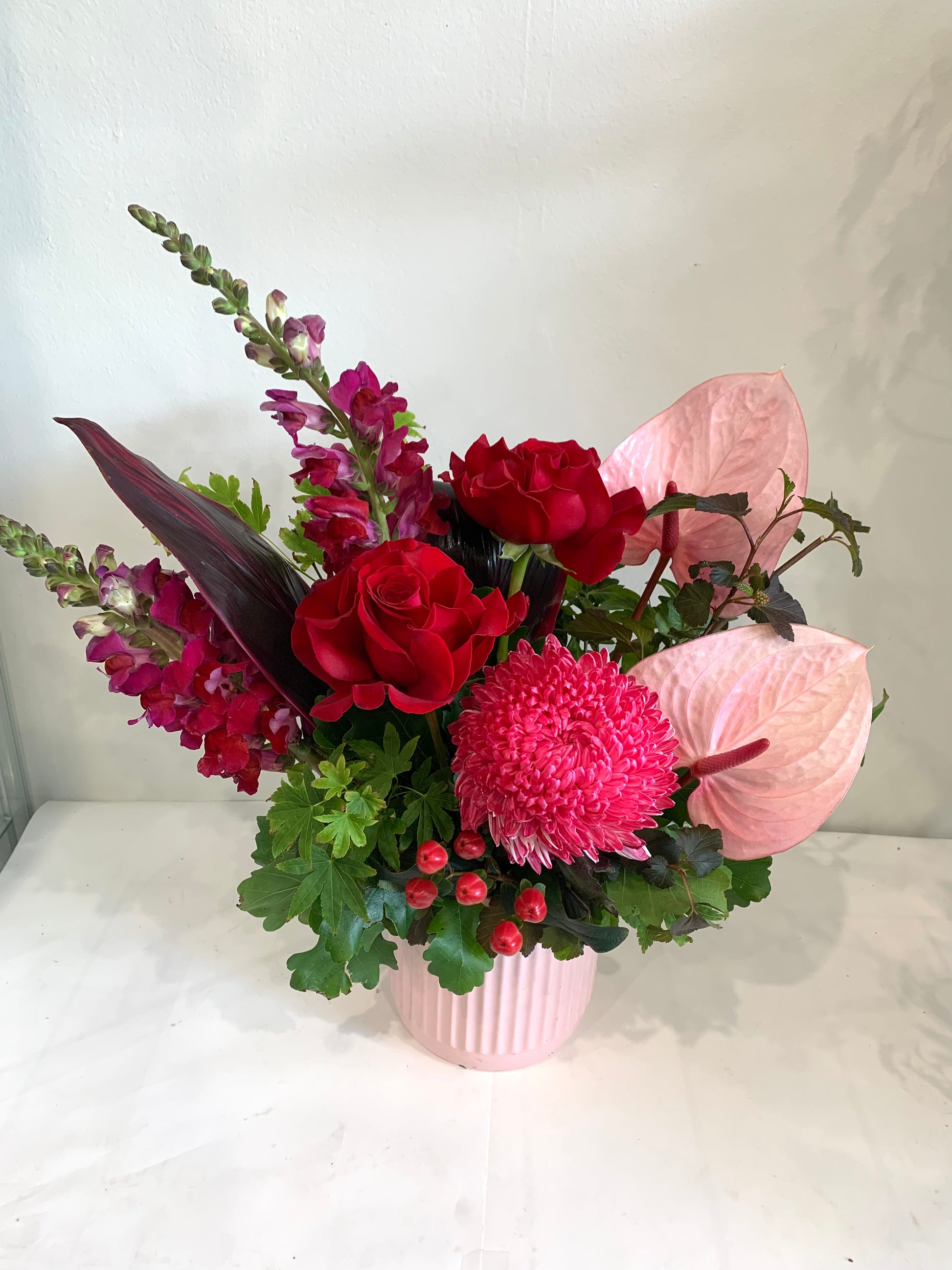 Kayla is a stunning pot arrangement that features a beautiful mix of burgundy, red and pink tones with seasonal flowers. With its vibrant colors and carefully selected blooms, this arrangement is sure to add a touch of elegance and charm to any space. Handcrafted by our expert florists, each Kayla is a unique and timeless piece that will bring joy to any recipient.