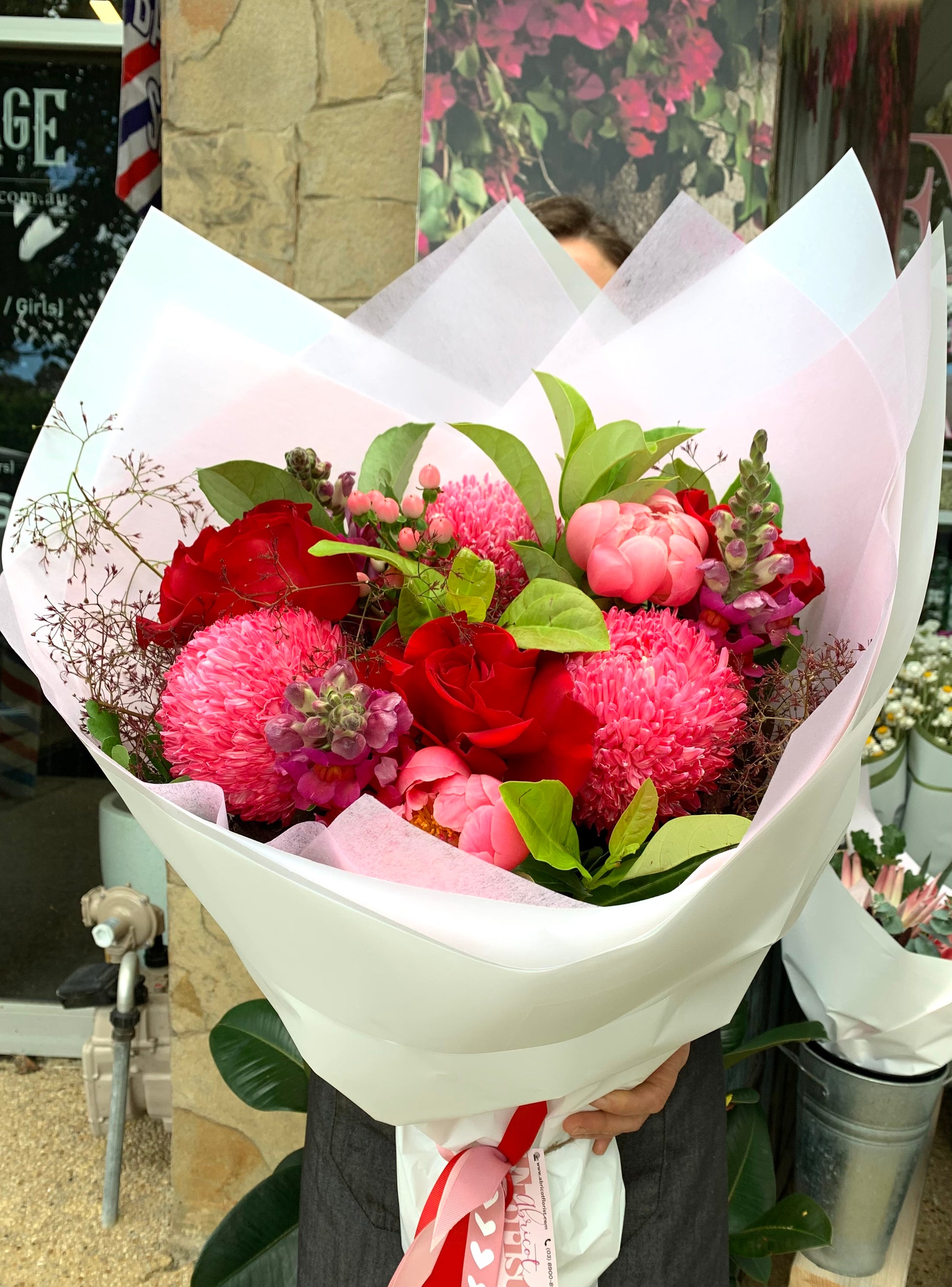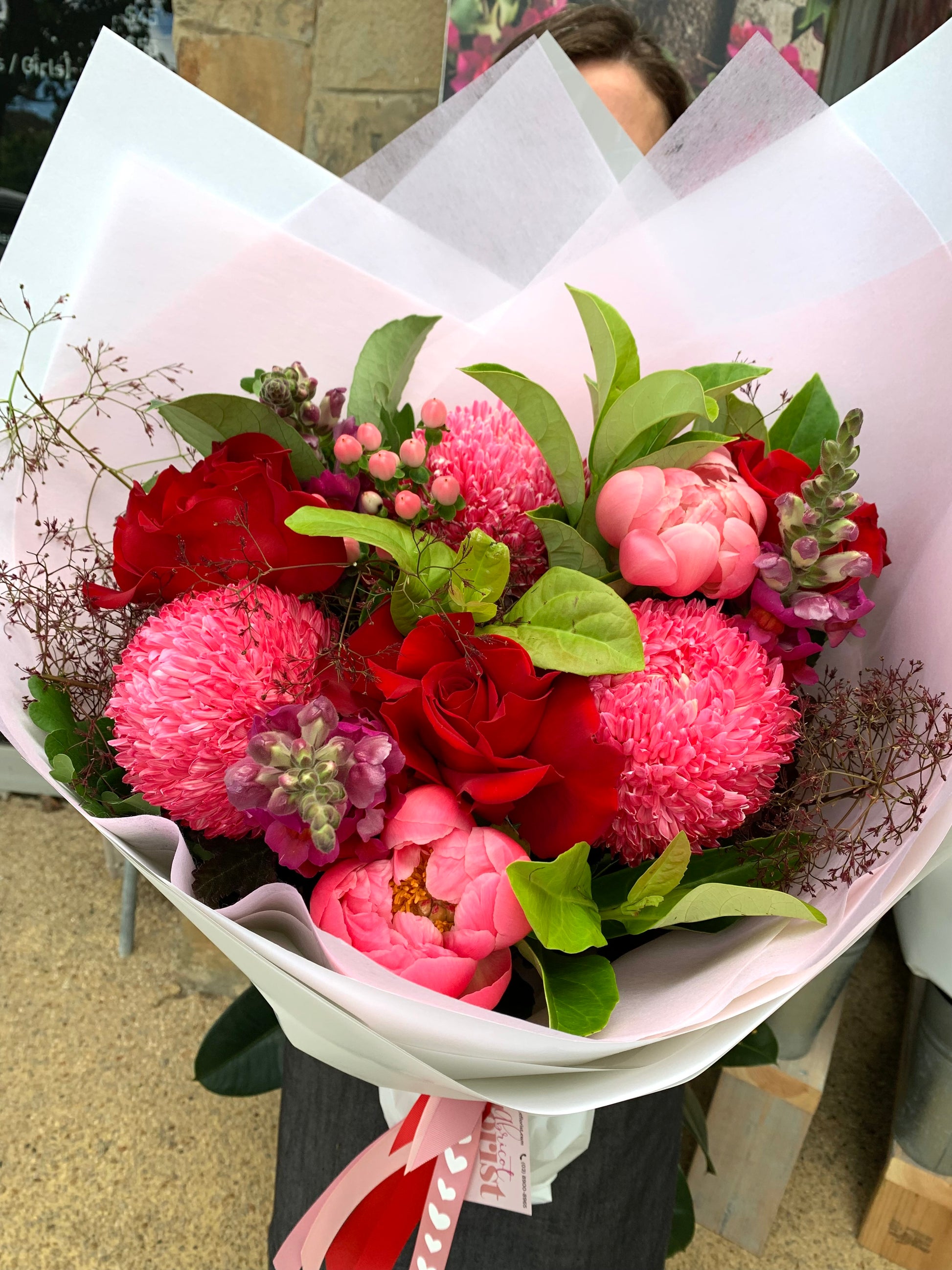 Mistletoe- Includes a beautiful blend of red, green and coral colours.A stunning festive bouquet.